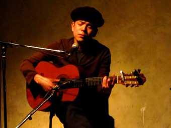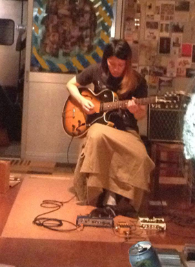 ジェフはアメリカのニューヨーク出身。2012年から京都に住む事になった。今回のライブは歌とギターだけで、ジャンルはどっちかと言うとロックとアメリカンフォークミュジクのまざり。普段は陶芸家で、東山区の工房で焼き物を作っています。