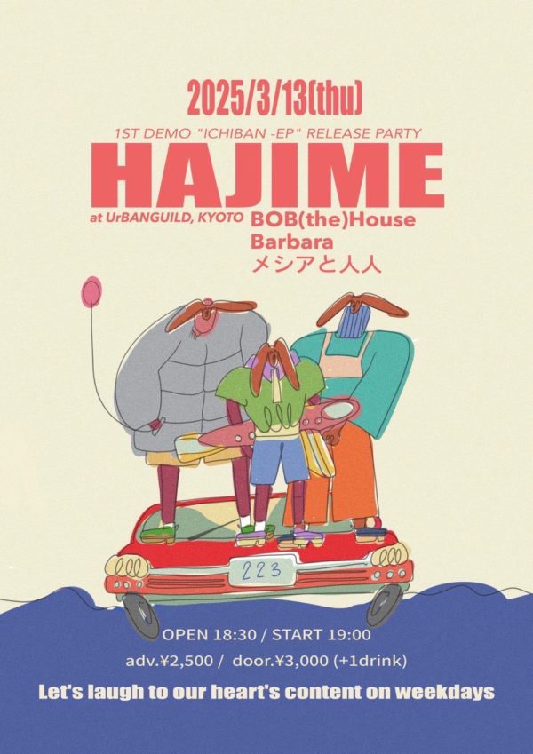 3/13 (thu)𝘽𝙊𝘽(𝙩𝙝𝙚)𝙃𝙤𝙪𝙨𝙚 1st Demo “ichiban -EP” Release Party✴︎ 「hajime」 at UrBANGUILD, KYOTO
