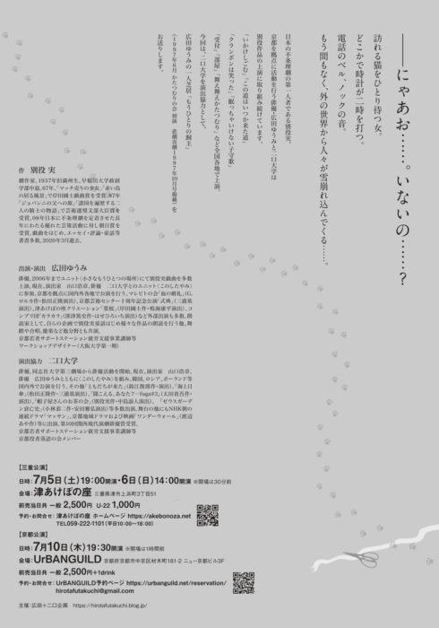 日本に於ける不条理劇の第一人者である別役実。京都を拠点に活動を行う俳優・広田ゆうみと二口大学はその作品の上演に取り組み続けています。今回は、二口大学を演出協力として、広田ゆうみの一人芝居をお送りします。
