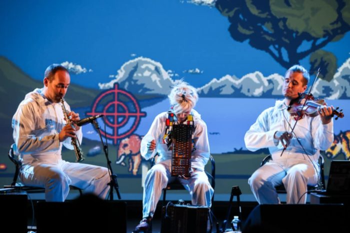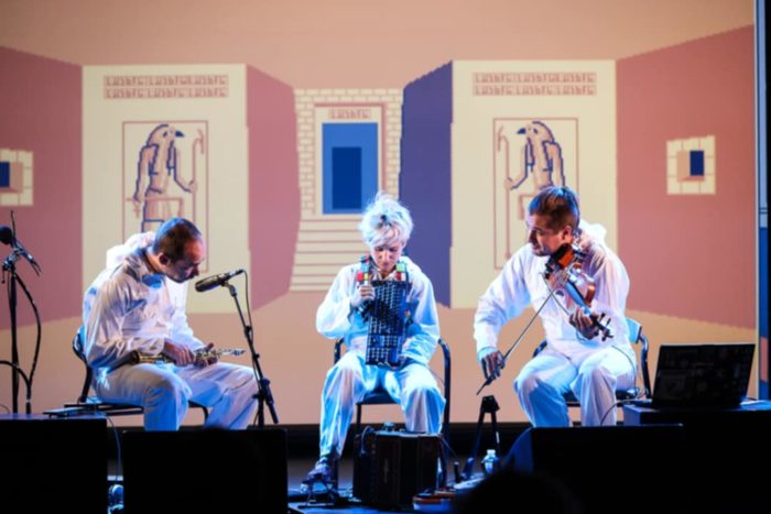 SUPERPHOSPHATE is a tribute to popular dance in the broadest sense, with a repertoire ranging from folk dances to modern grooves. To achieve this, acoustic instruments (saxophone, accordion and violin) are mixed with much more electronic and curious instruments (samplers, talkbox, “bidules” and computer keyboards), designed and built by Matthieu Metzger aka Dr Systole. A video artwork interacts with the music in order to create a sonic and visual journey that is sometimes poetic, sometimes nerdy and psychedelic. SUPERPHOSPHATE is an oldschool electronic ballroom, an 8-bit fever dream, like a end-of-the-world geek party. Watch it, listen to it, dance to it.